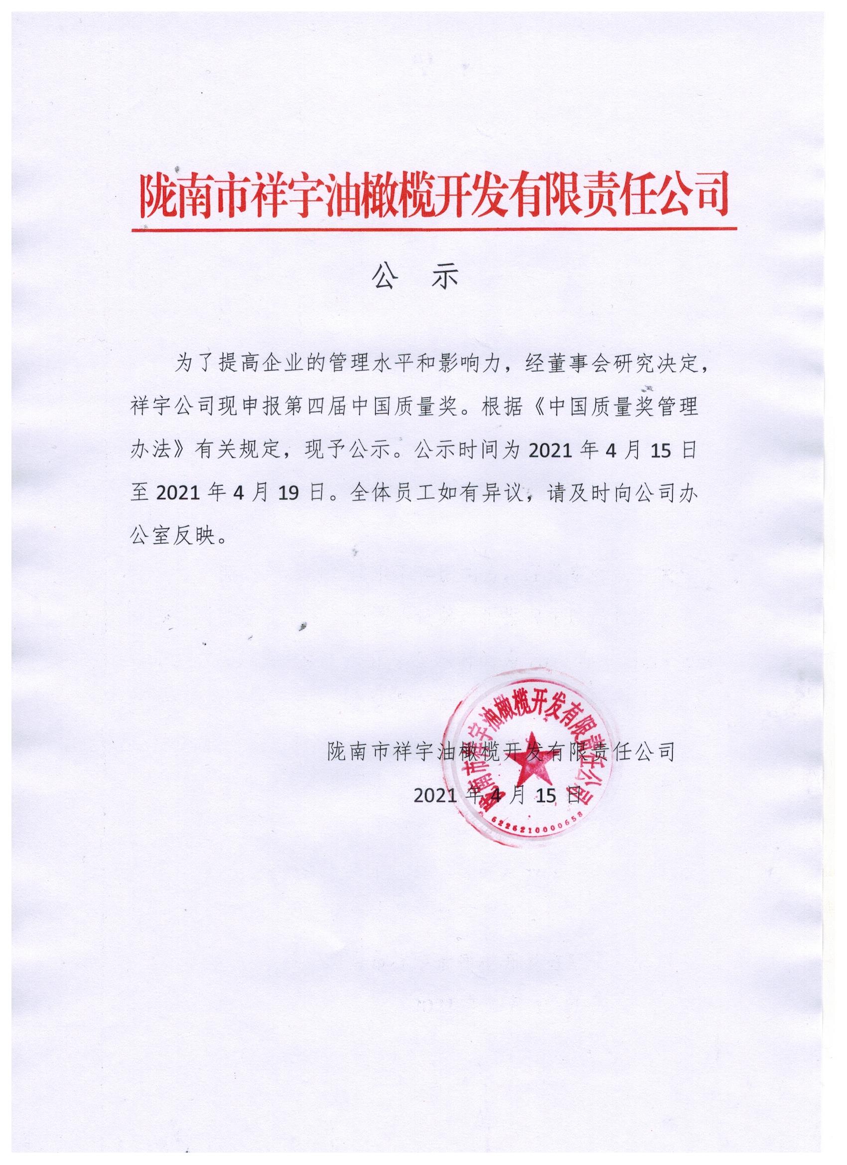 隴南市祥宇油橄欖開發(fā)有限責任公司關于申報第四屆中國質量獎的公示